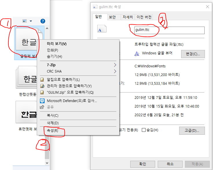 - 원하는 폰트의 경로(파일이름)를 획득 합니다.(gulim.ttc)